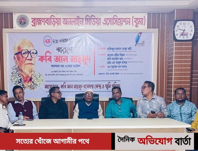 রবিবার বিকেল ৪টায় কবি আল মাহমুদ গবেষণা কেন্দ্রের উদ্যোগে ব্রাহ্মণবাড়িয়া অনলাইন মিডিয়া এসোসিয়েশনের কার্যালয়ে এক আলোচনা ও স্মরণসভা অনুষ্ঠিত হয়।