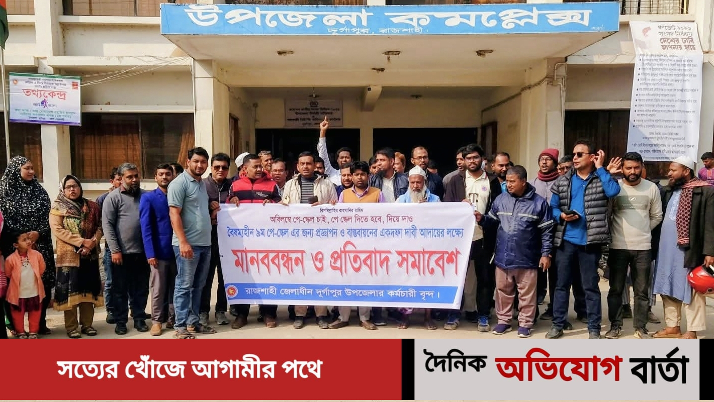 রাজশাহীর দুর্গাপুরে ৯ম জাতীয় পে-স্কেল বাস্তবায়নের দাবিতে মানববন্ধন ও প্রতিবাদ সমাবেশ করেছেন তৃতীয় ও চতুর্থ শ্রেণির সরকারি কর্মচারীরা।