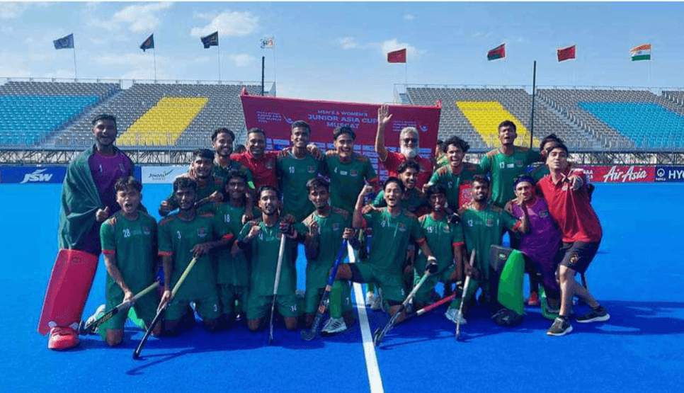 আম্পায়ারের শেষ বাঁশি। বাংলাদেশ দলের খেলোয়াড়দের উল্লাস। ডাগ আউট থেকে ছুটলেন কোচরা। ওমানের মাসকটে যুব এশিয়া কাপ হকিতে থাইল্যান্ডকে ৭-২ গোলে হারিয়ে বাংলাদেশ অ-২১ দল যুব বিশ্বকাপ নিশ্চিত করেছে। যা বাংলাদেশের হকির ইতিহাসে এই প্রথম।