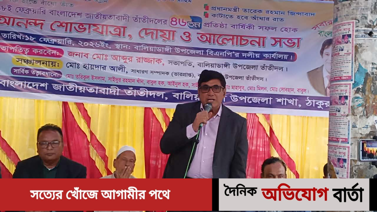 দেশনেত্রী বেগম খালেদা জিয়া চির অম্লান শক্ত হাতে বাঁধো তাঁতীদল, প্রধানমন্ত্রী তারেক রহমান জিন্দাবাদ কাটতে হবে আঁধার রাত এই স্লোগানকে সামনে রেখে বালিয়াডাঙ্গী উপজেলা তাঁতীদলের ৪৬ তম প্রতিষ্ঠা বার্ষিকী উপলক্ষে আনন্দ শোভাযাত্রা দোয়া ও আলোচনা সভা অনুষ্ঠিত হয়।
