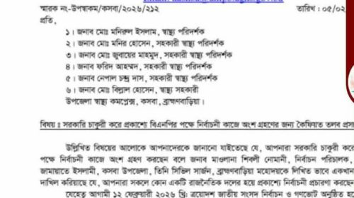 মোঃ নিশাদুল ইসলাম নিশাদ,ব্রাহ্মণবাড়িয়া প্রতিনিধি ত্রয়োদশ জাতীয় সংসদ নির্বাচনে ব্রাহ্মণবাড়িয়া-৪ আসনের বিএনপি প্রার্থী পক্ষে নির্বাচনি প্রচারণায় অংশ নেওয়ায় উপজেলা স্বাস্থ্য বিভাগের ৬ কর্মকর্তাকে শোকজ করা হয়েছে। বৃহস্পতিবার (৫ ফেব্রুয়ারি) দুপুরে…
